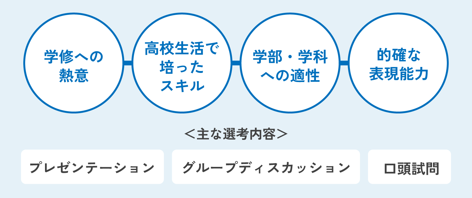 本学の総合型選抜は、志願者の学修に対する意欲、適性、能力などを総合的に評価します。「この学部・学科で学びたい」「入学後はこんなことをやってみたい」「こんなふうに将来へ活かしたい」などといったみなさんの熱意や、高校生活で培ったスキルを、選抜内容に合わせて的確に表現する力が、この制度における重要ポイントになるでしょう。
