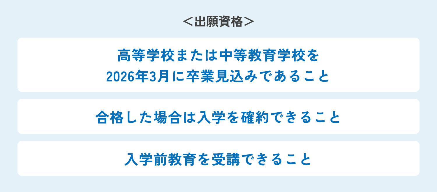 出願資格は「高等学校または中等教育学校を2026年3月に卒業見込みであること」「合格した場合は入学を確約できること」「入学前教育を受講できること」のみ。みなさんの学びたいという熱意を応援します。