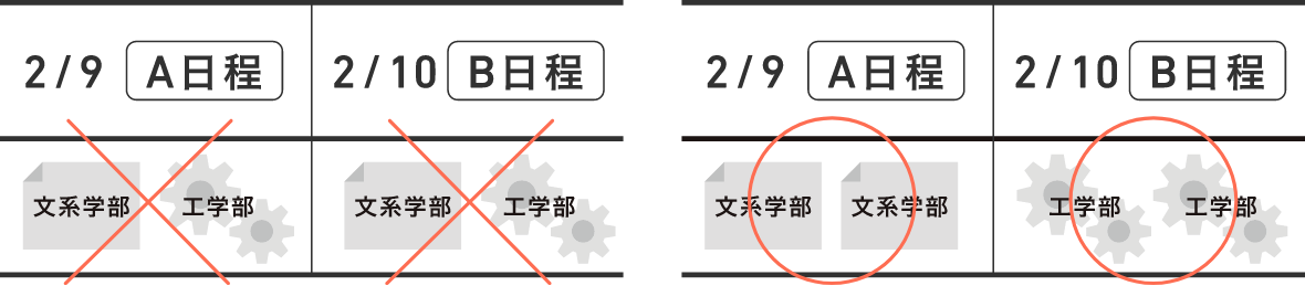 例)A日程:経済学部 B日程:工学部 〇