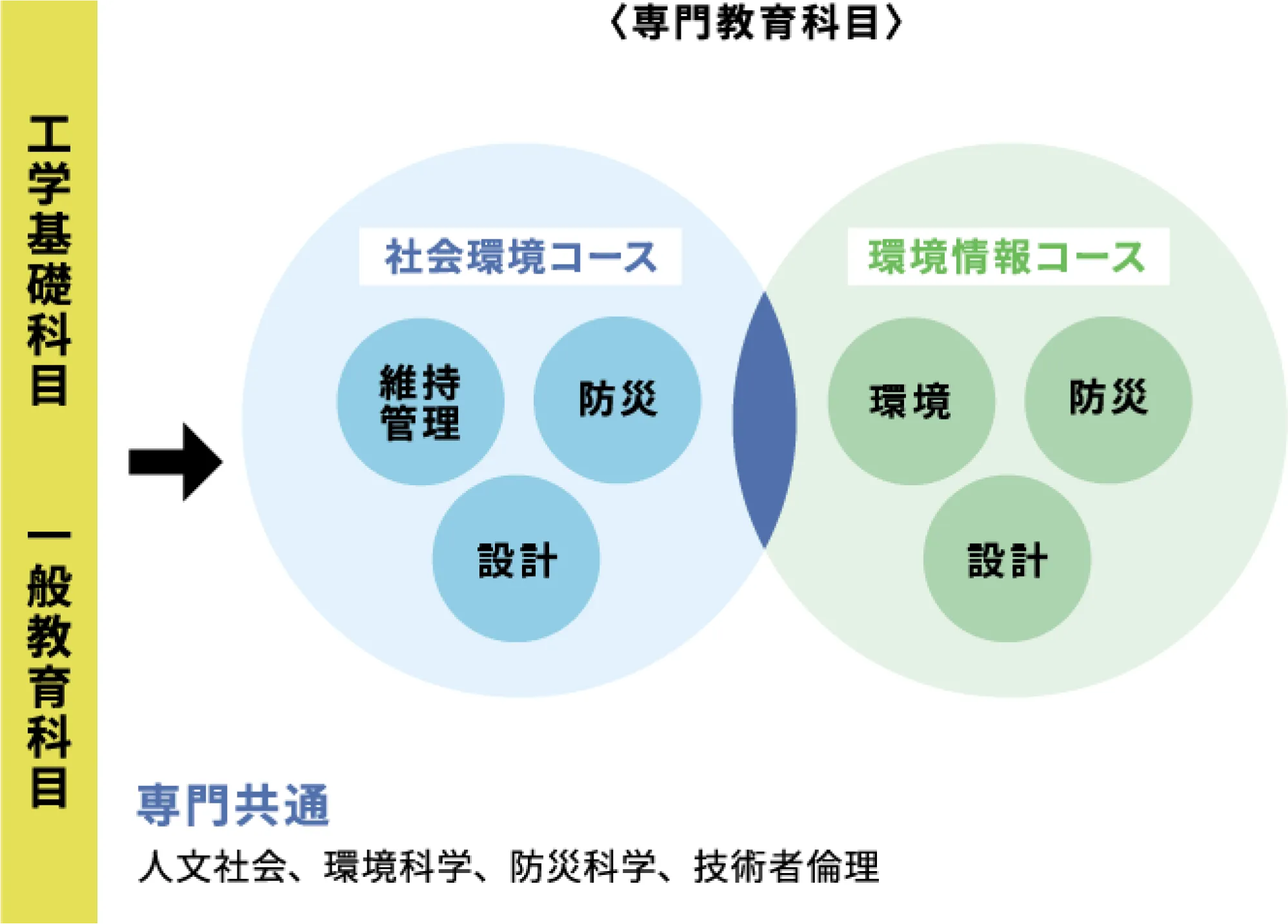 社会環境⼯学科には2つのコースがあります。「社会環境コース」は、安全・安心な生活基盤、および経済活性のための生産・流通基盤等の計画、設計、建設などの基礎的な教育を行い、“専門建設技術者“を育成します。「環境情報コース」は、環境保全対策、防災政策、福祉政策に必要なリスク管理、社会調査、および合意形成等を習熟。環境配慮を⽋かさない人間中心の視野を持ち、あらゆる人にとって優しい、安全・安心なまちをつくる”⽂理融合型の技術者”を育成します。