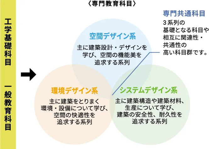 専門教育科目は分野別に「空間デザイン系」「環境デザイン系」「システムデザイン系」の3系列に分類。カリキュラムが一級建築士、二級建築士試験に対応しているため、受験資格を取得できます。