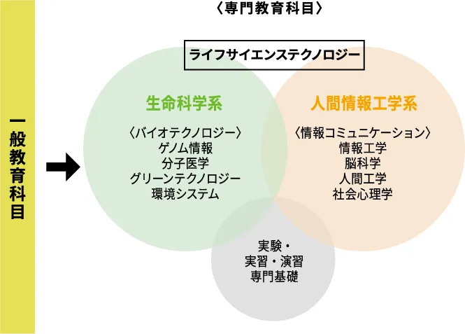 ゲノム情報、分子医学、グリーンテクノロジーなど次世代の最先端⼯学である「生命科学(バイオテクノロジー)」と情報⼯学、脳科学、人間⼯学など「人間情報⼯学(情報コミュニケーション)」の両⾯を網羅するライフサイエンステクノロジーについて学びます。また、それらを取り巻く環境システムや社会心理学なども研究の範囲と位置づけ、地域・国際社会のニーズを的確に捉える広い洞察力と、生命・地球環境への高い倫理観を併せ持つ人材を育成します。