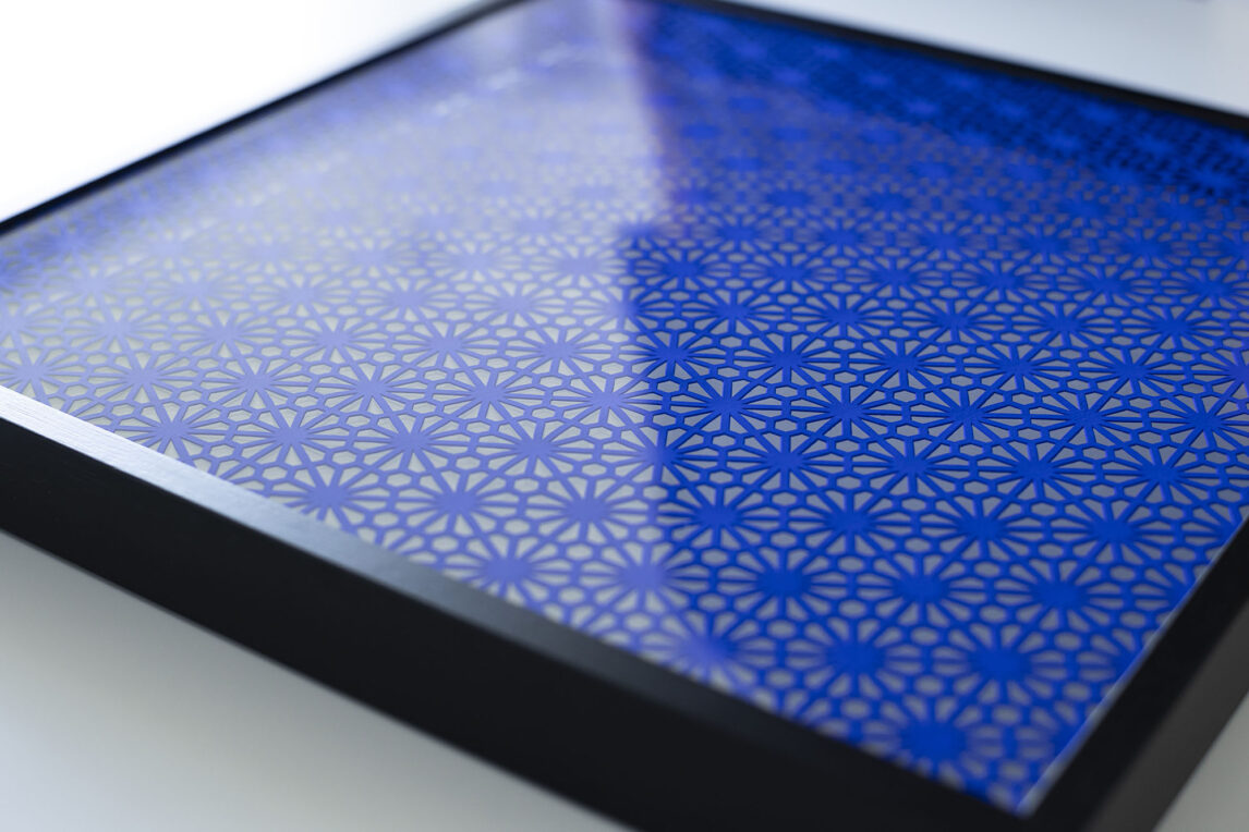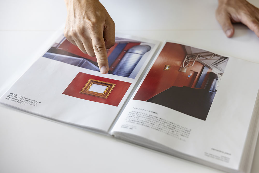 「絵を壁に飾る際に、絵を主役として考えてしまうのはなぜだろう?」と考え始めてから、気がつけば、本来、絵が入る額縁に絵を入れずに後ろの壁を閉じ込め、額縁の外側をペイントしていました。要するに、本来の主役と脇役の反転です。絵を描いて作品にするのではなく、既にそこにある“モノ”に照準をおいた作品ですね。昔は、壁や床に直接手を加えて部屋全体を作品にしていましたが、最近は紙や鉄に穴を開けて、その穴の集合や形状によって画像や模様が浮き出てくる切り絵状の手法を用いて作品制作に取り組んでいます。まるで背景色の絵の具を使って描いたかのように。
