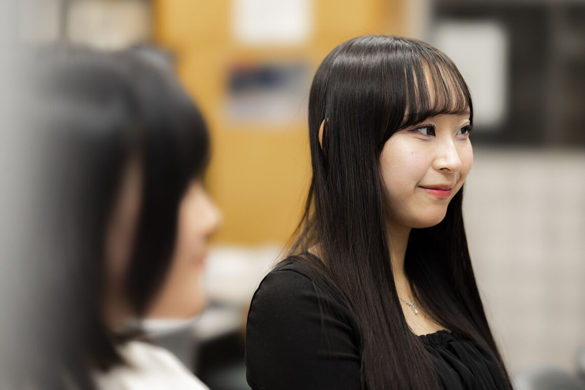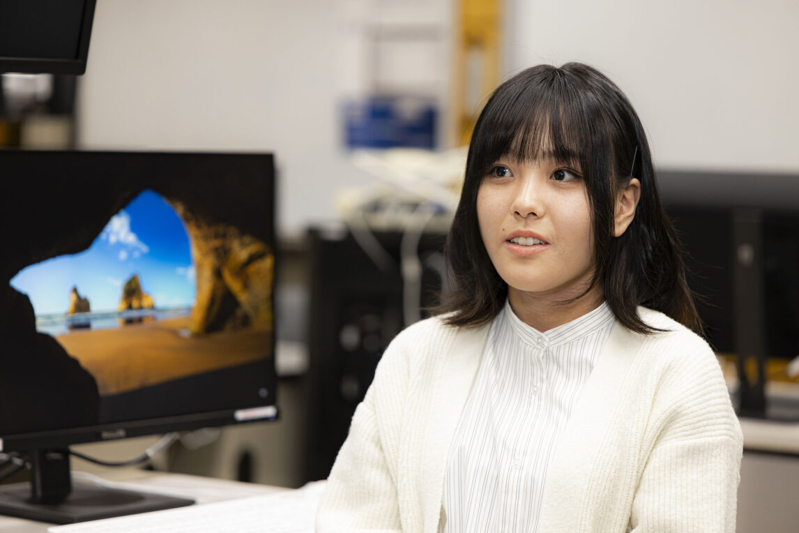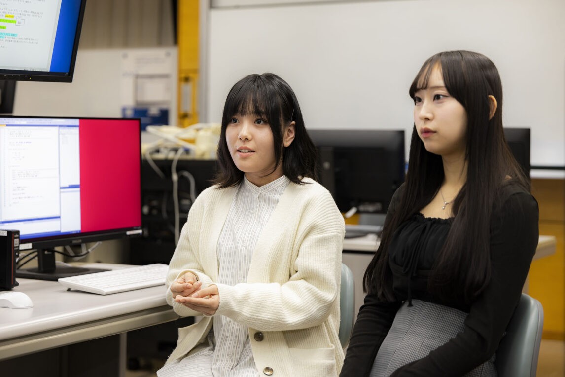 【成田】小学校の頃に父がプログラミングの本を買ってくれて、プログラミングが大好きになりました。中学、高校時代も独学を続け、趣味としてゲームを作ったり、いろんな言語を試したりしていました。将来は工学部で学ぼうと小学生の頃から決めていて。女子は少ないだろうと思っていましたが、友達もできましたし、演劇部の活動もしているので楽しいキャンパスライフを送っています。