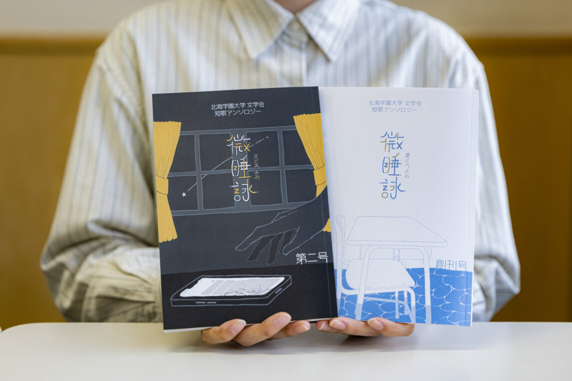 ちょうどその頃、十月祭で文学会の展示に足を運び、2部学生でも入部できることを知り、私も文学会に所属。実は、以前から自分の気持ちを言語化するのが苦手で、あえて言葉で表現することを避けていたところがあります。それと同時に、自分の創作を言葉にして、文字で表現してみたいという思いもありました。文学会では、メンバーのサポートもあり、短歌を中心に小説や会報誌のコラムの執筆にも挑戦。それまで一人で過ごすことが多かったのですが、人と交流する機会が格段に増え、その人の考え方や生き方が表現に反映されることに気づき、さまざまな刺激を受けることができました。これまで何気なく見ていた風景も、短歌にしようと思うと、見方が変わるんです。文学会の短歌アンソロジーの創刊号制作チームにも加わり、仲間とゼロから物を作り上げる喜びを味わうこともできました。