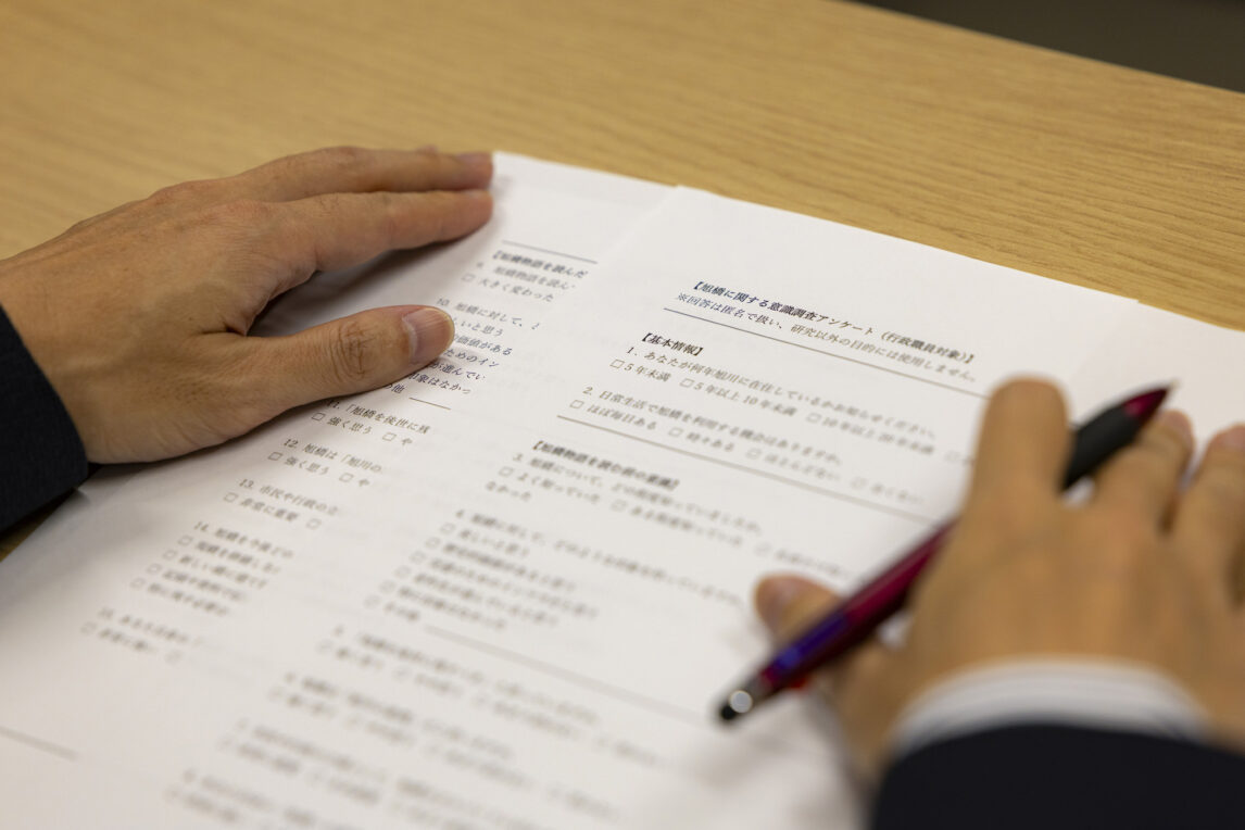 完成した物語は旭川市役所に持参し、7人の職員さんに読んでもらったのですが、事前に旭橋への印象や考えについて質問する2種類のアンケートを用意しました。物語を読む前と後で、それぞれ回答してもらいました。